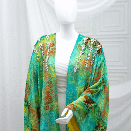 A modern, unique raw silk with voile dress , hand-embellished with luxurious stones, paired with an abaya.