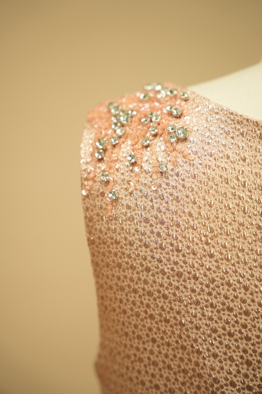 Dress made of jacquard fabric with silk taffeta, hand-embellished with sequins and luxurious stones.