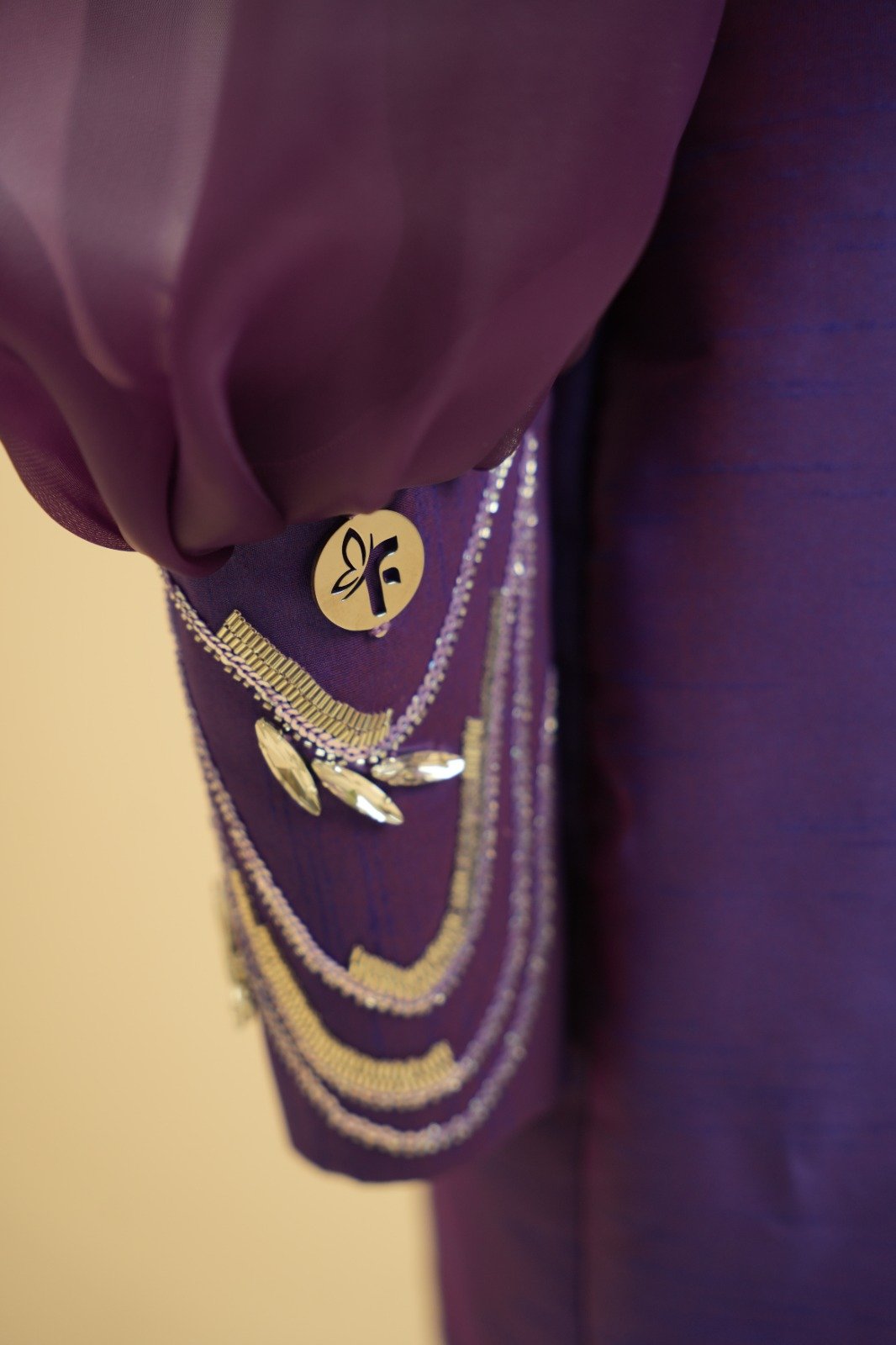 Dress made of silk taffeta with organza, hand-embellished with stones and beads.