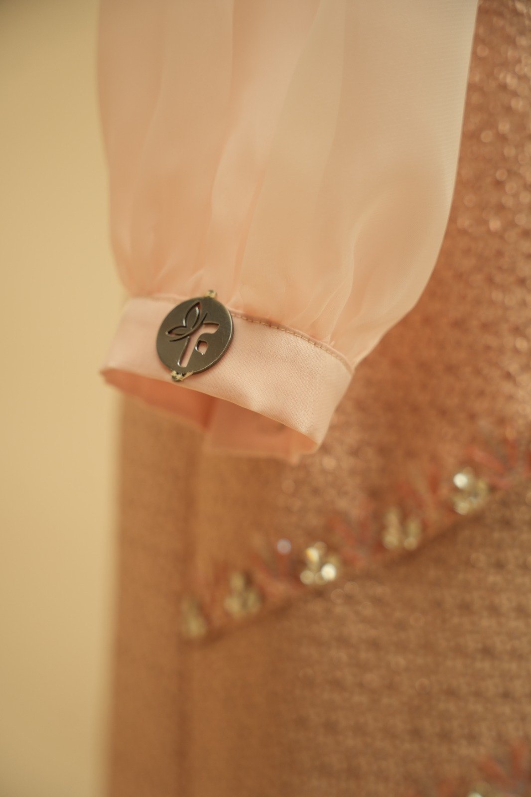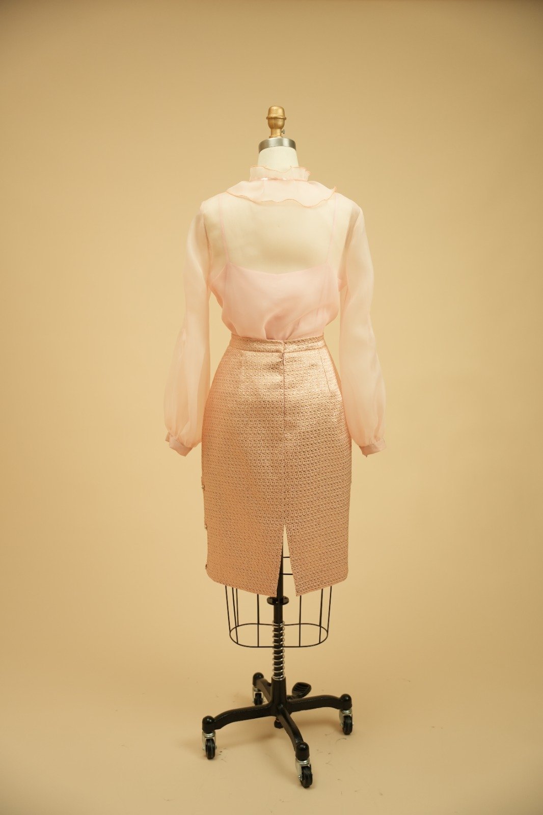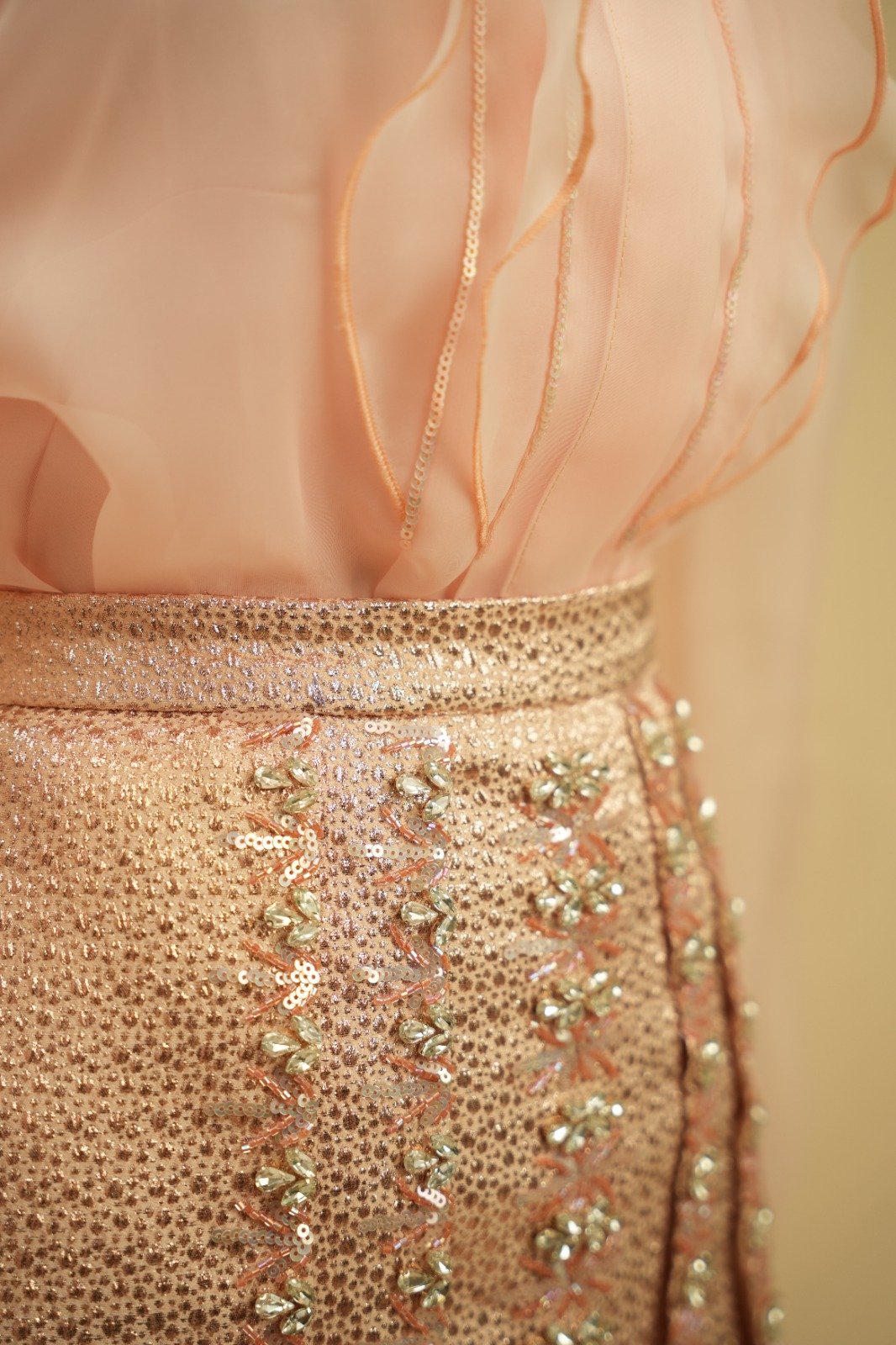 Two-piece set with a jacquard skirt, hand-embellished with luxurious stones, paired with an organza blouse.