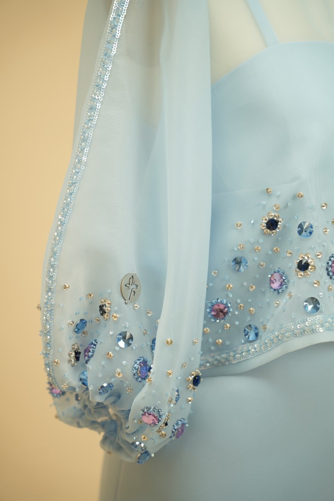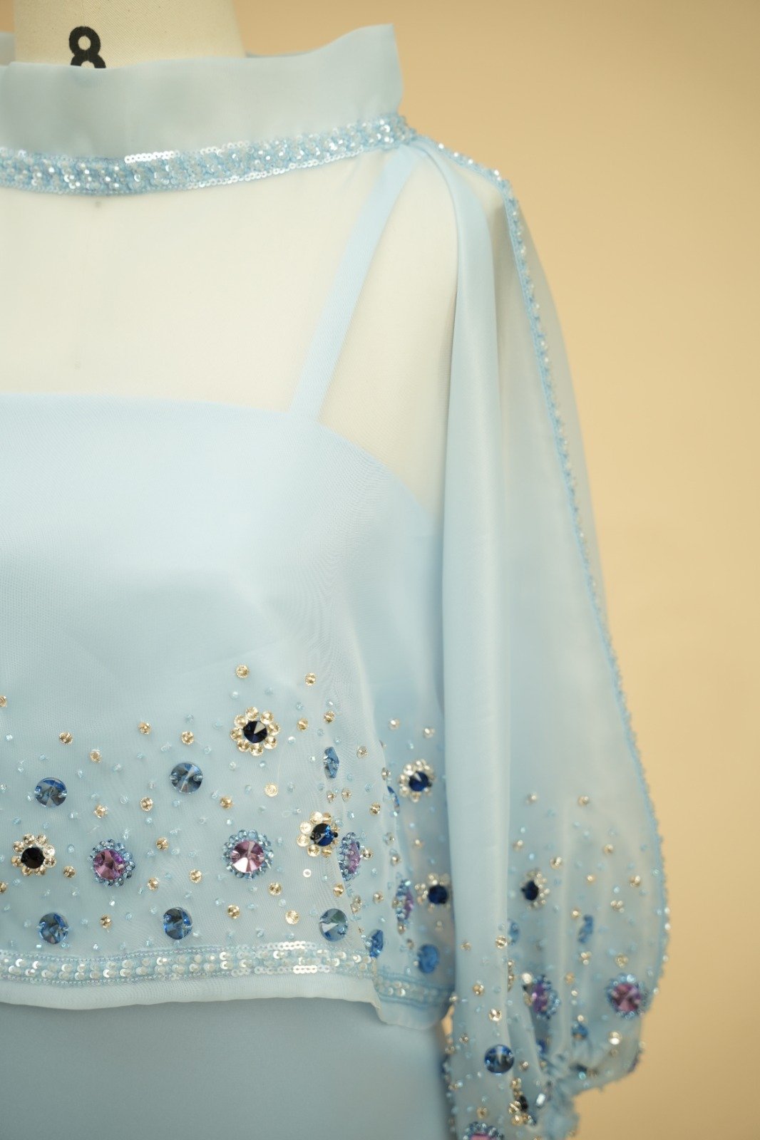 Two-piece set with a satin dress and an organza blouse, hand-embellished with sequins and stones.