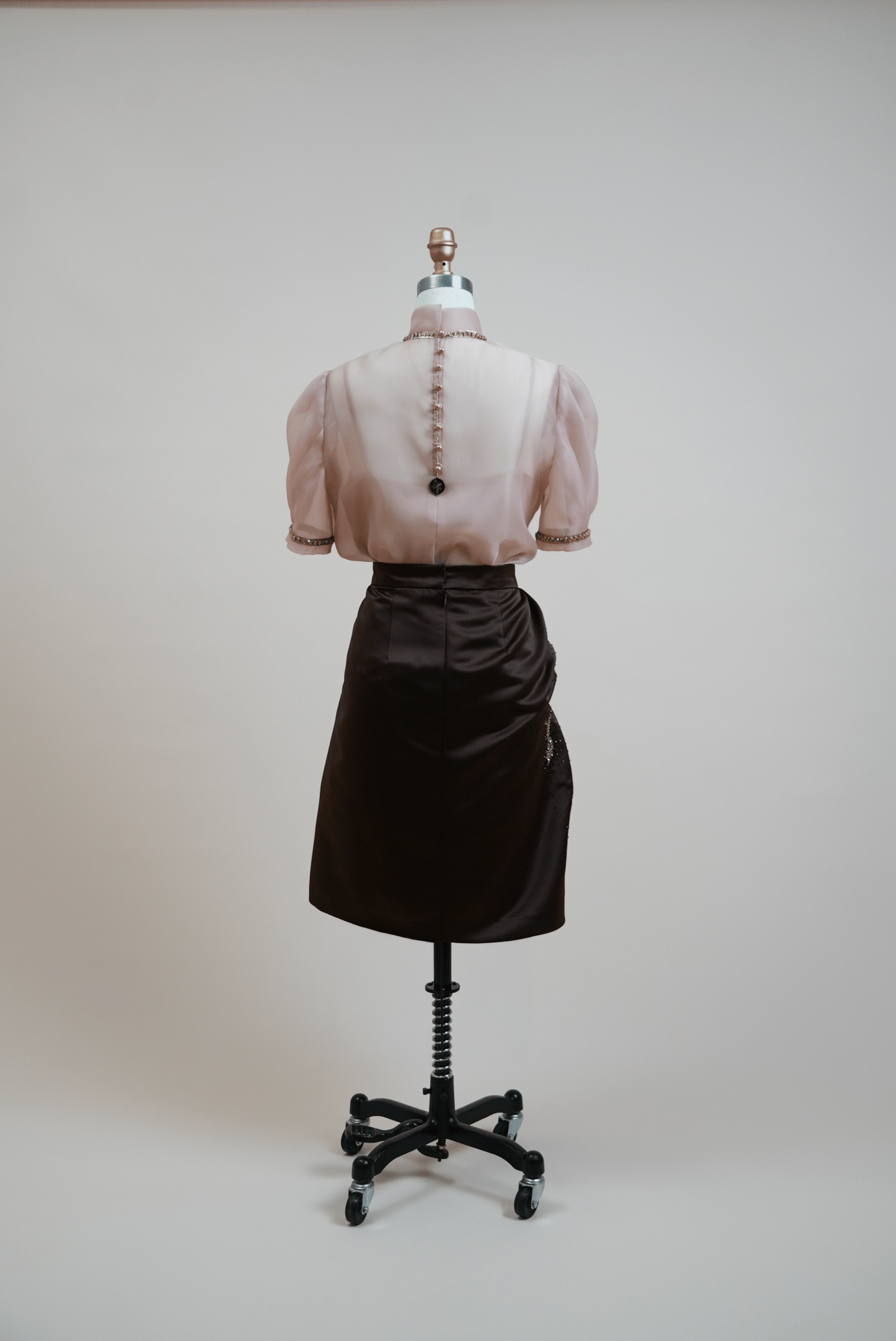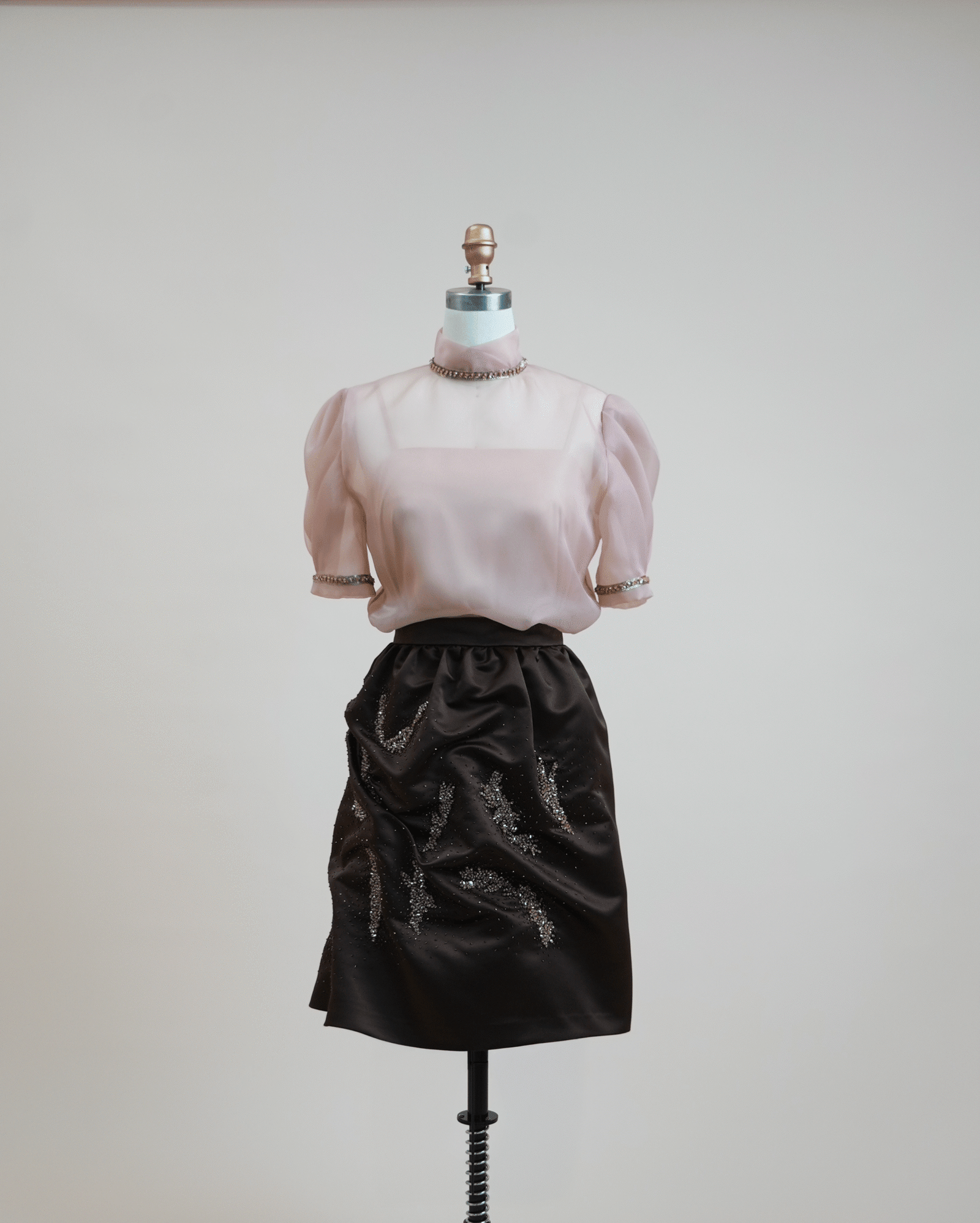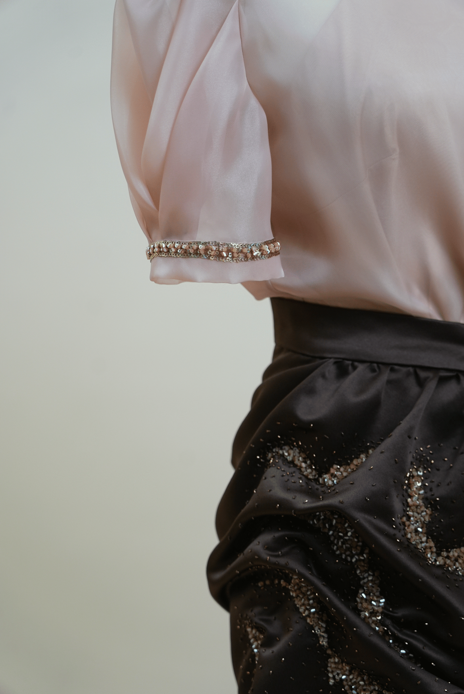 Two-piece set with a skirt made of fine Korean satin, hand-decorated with precious stones, paired with a Korean organza blouse.