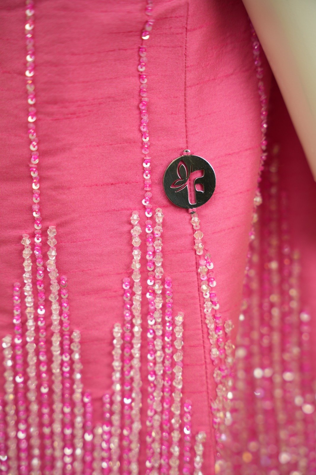 Two-piece set with pants and a blouse made of silk taffeta, hand-embellished with beads and sequins.